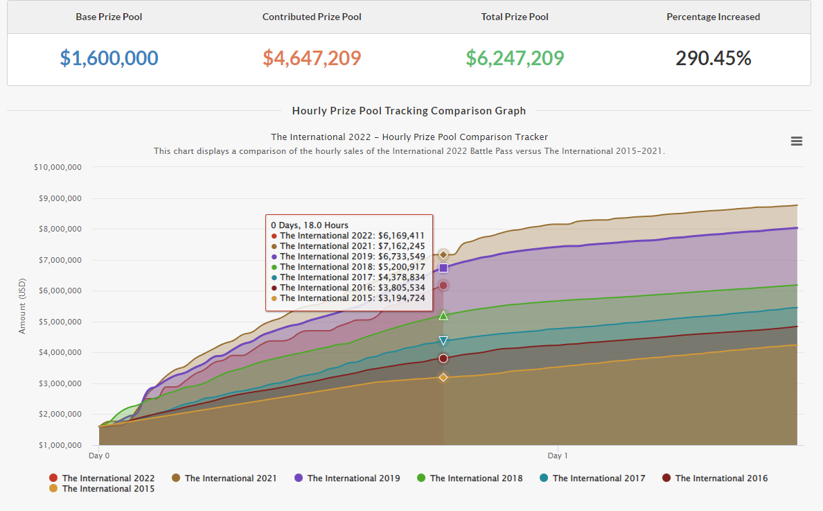 Спустя 18 часов после выхода Battle Pass 2022 игроки собрали в призовой фонд The International 6,16 млн долларов – за это же время призовой фонд TI10, собранный в 2021 году, составлял 7,16 млн долларов.