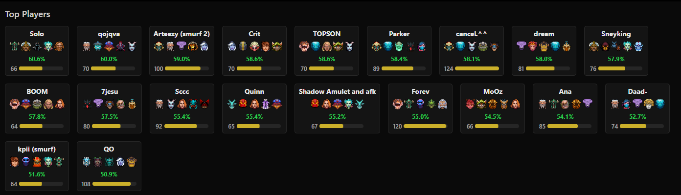 На втором месте находится Макс «Qojqva» Брокер (60% за 70 матчей), третьем – смурф Артура «Arteezy» Бабаева (59% за 100 матчей).