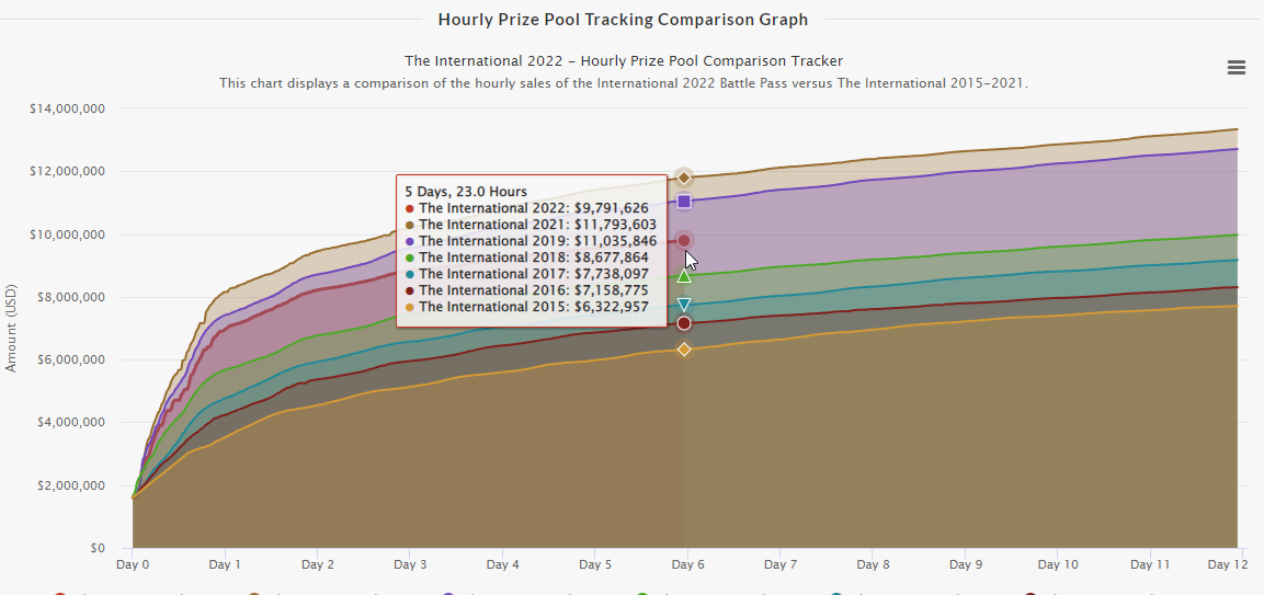 По истечении первых суток с начала продаж призовой фонд TI11 рос медленнее, чем на TI10 и TI9. Со временем отставание только увеличивалось и выросло до $2 млн через 5 дней и 23 часа после начала продаж.