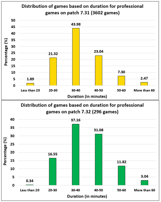 Количество матчей длительностью 40-50 минут, 50-60 минут и 60+ минут в патче 7.32 выше, чем в 7.31: 31,08 против 23,04%, 11,82 против 7,30% и 3,04% против 2,47% соответственно.