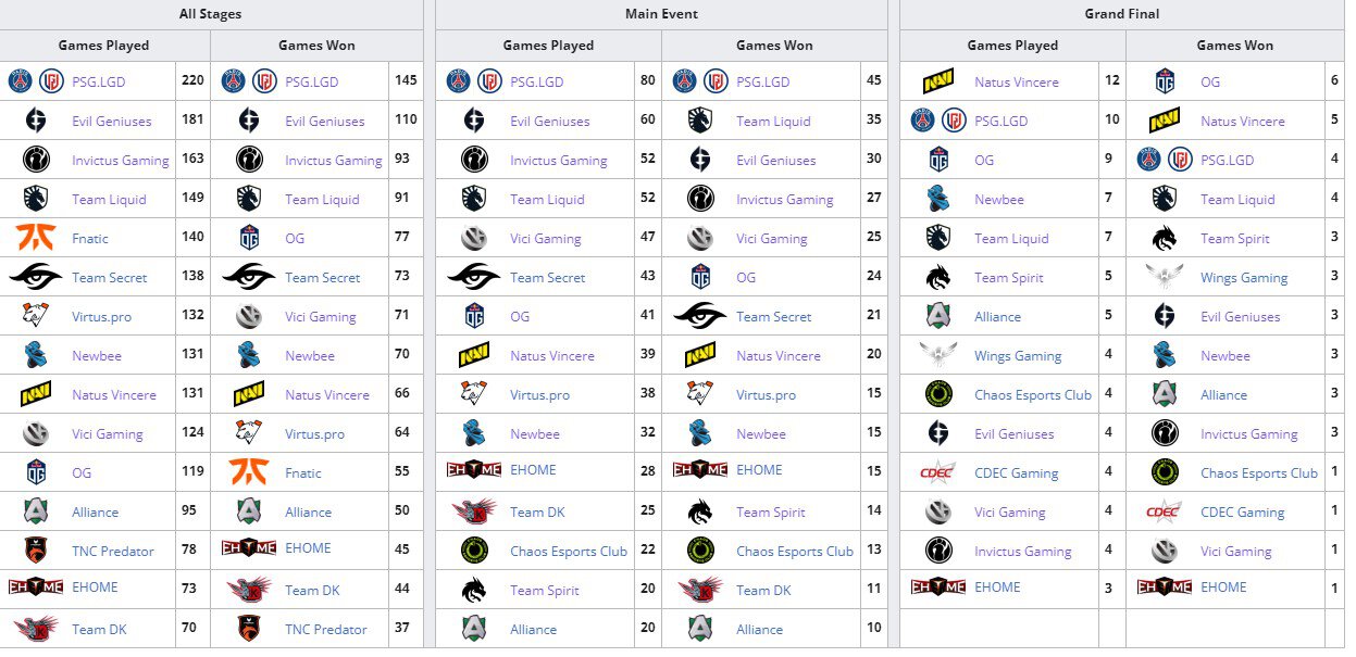 У PSG.LGD больше всего игр и побед на The International. NAVI, Virtus.pro и Newbee – в топ-10