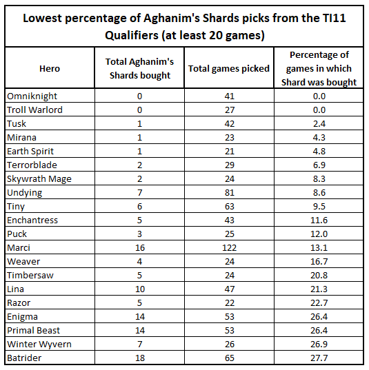 Игроки ни разу не купили Шарды на Омнинайта (41 пик) и Тролля (27 пиков) на квалификациях к TI11