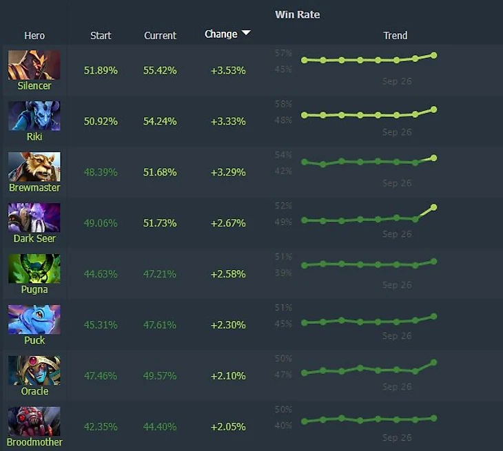 Винрейты Сайленсера, Рики и Брюмастера выросли на 3% после патча 7.32c. Доля побед Пуджа поднялась на 0,18%