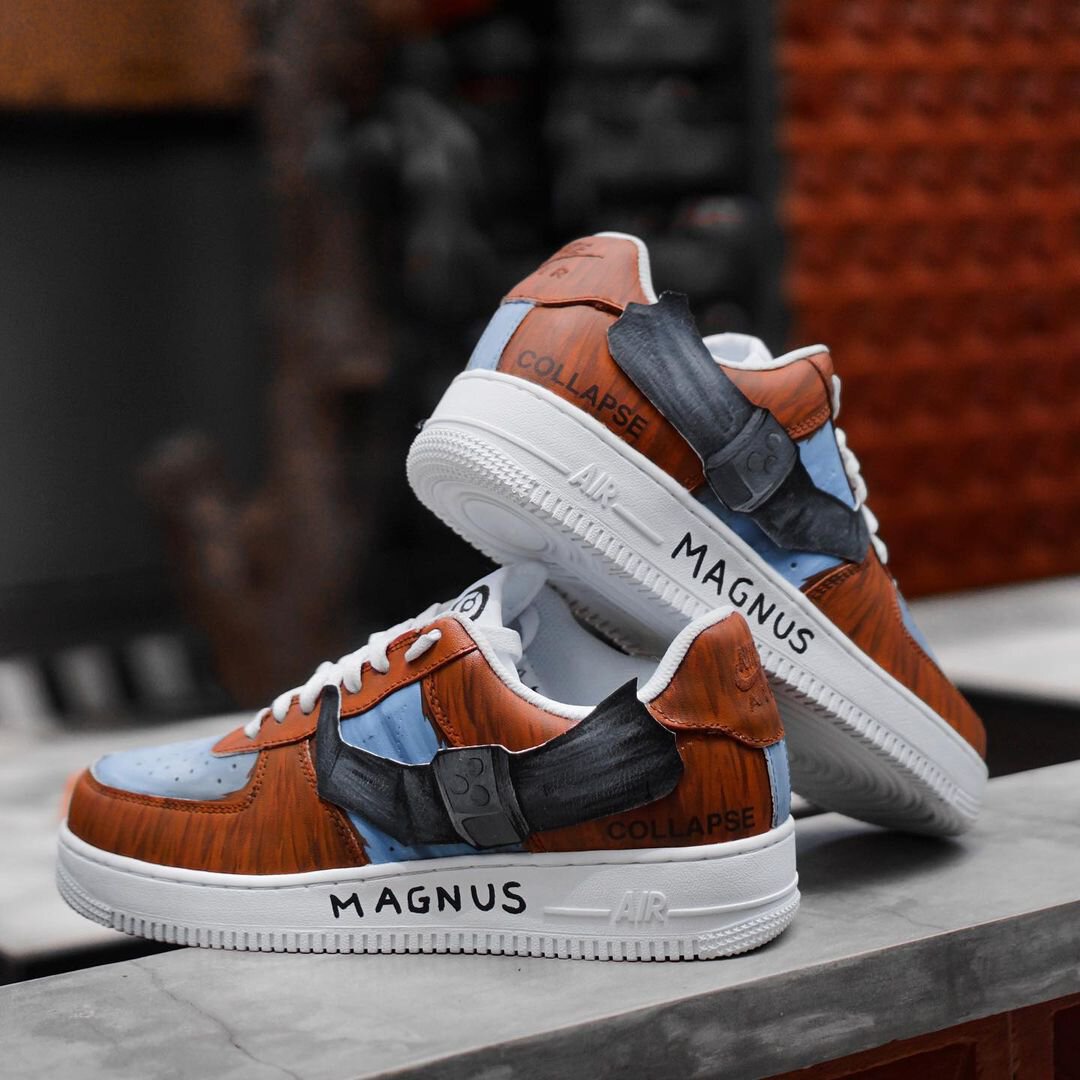 Кроссовки выпущены в единственном экземпляре на основе Nike Air Force. На язычке изображен Аегис, на боках – надписи Magnus и Collapse.