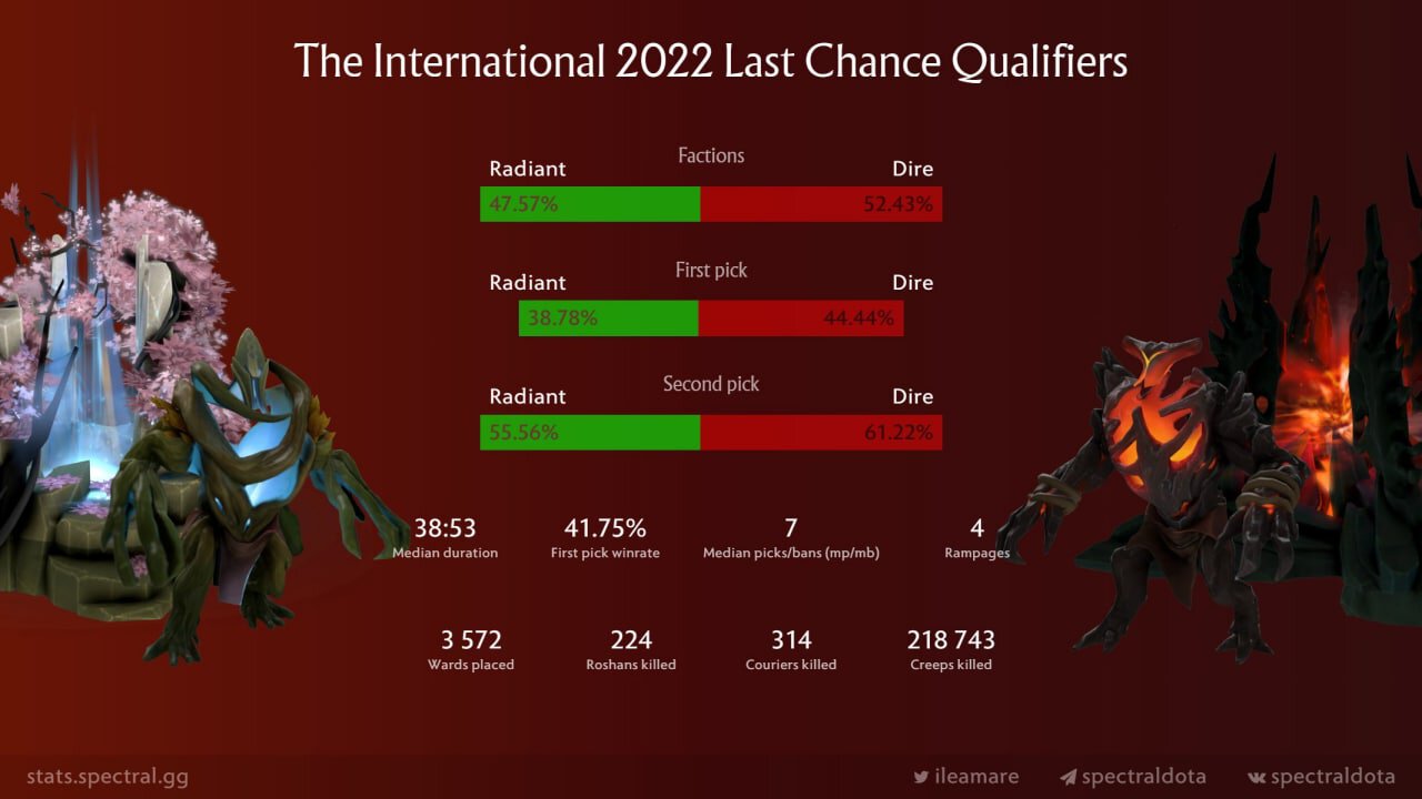 В LCQ чаще побеждали команды, которые играли за силы тьмы. Винрейт стороны составил 52,43%. Средняя продолжительность матча – почти 39 минут. Также во время отборочных было сделано 4 ремпейджа, убито 224 Рошана и добито 218 743 крипов.