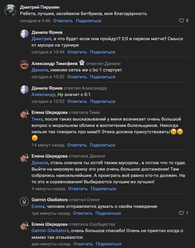 Этика должна присутствовать!“ – ответила Елена Шкредова, мама Антона «Dyrachyo» Шкредова, на комментарий в ВК. Комментарий, на который отвечала Елена, удалили модераторы сообщества Gladiators.