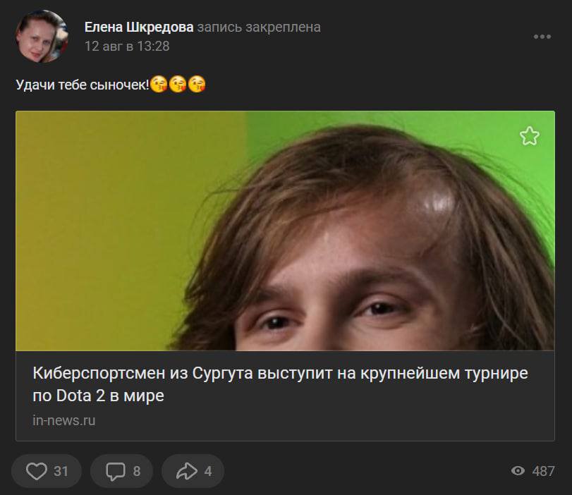 У себя на стене Елена репостнула новость о том, что Dyrachyo сыграет на «крупнейшем турнире по Dota 2 в мире» и сопроводила ее подписью «Удачи тебе, сыночек!»