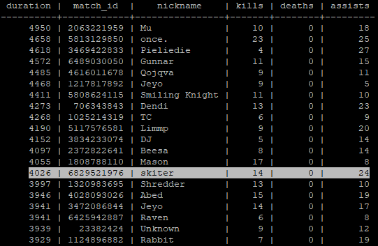 На первом месте находится встреча Newbee и Newbee.Young на The Shanghai Major 2016 – тогда Чжан «Mu» Пан ни разу не умер за 1 час, 22 минуты и 30 секунд.