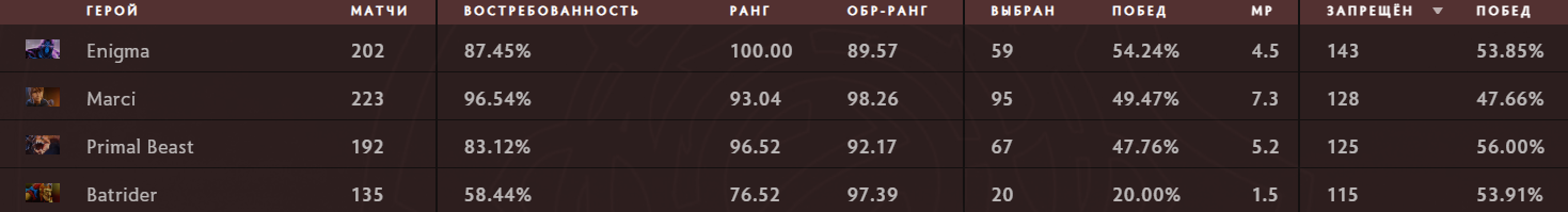 На 2-м и 3-м местах по данному показателю находятся Marci и Primal Beast – 128 и 125 запретов соответственно. При этом винрейт больше 50% из этих трех героев только у Энигмы – 54,24%.