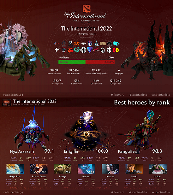 В среднем карты на турнире в Сингапуре продолжались 39 минут и 9 секунд. Было сделано 6 рэмпейджей, поставлено 8 547 вардов и убито 556 рошанов.