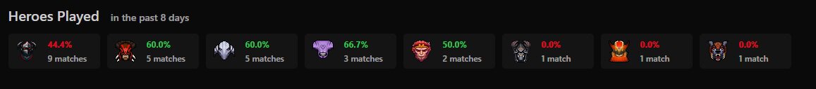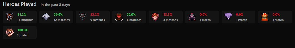 За последние 8 дней россиянин сыграл 77 пабликов, большинство из них – на роли керри. Самые популярные герои – Chaos Knight, Ursa, Sven, Bloodseeker.