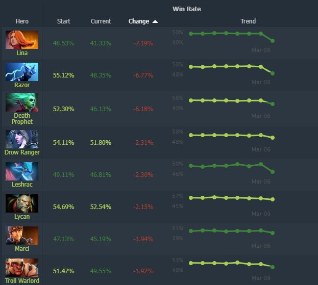 Больше всего в матчмейкинге упал винрейт Лины – на 7,19%. Также снизился процент побед Разора (-6,77%) и Баньши (-6,18%).