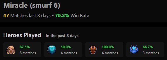 25-летний киберспортсмен, находящийся в инактиве, сыграл 47 рейтинговых матчей с винрейтом 70,2%. Самые популярные герои у Миракла сейчас – Invoker, Morphling, Anti-Mage.