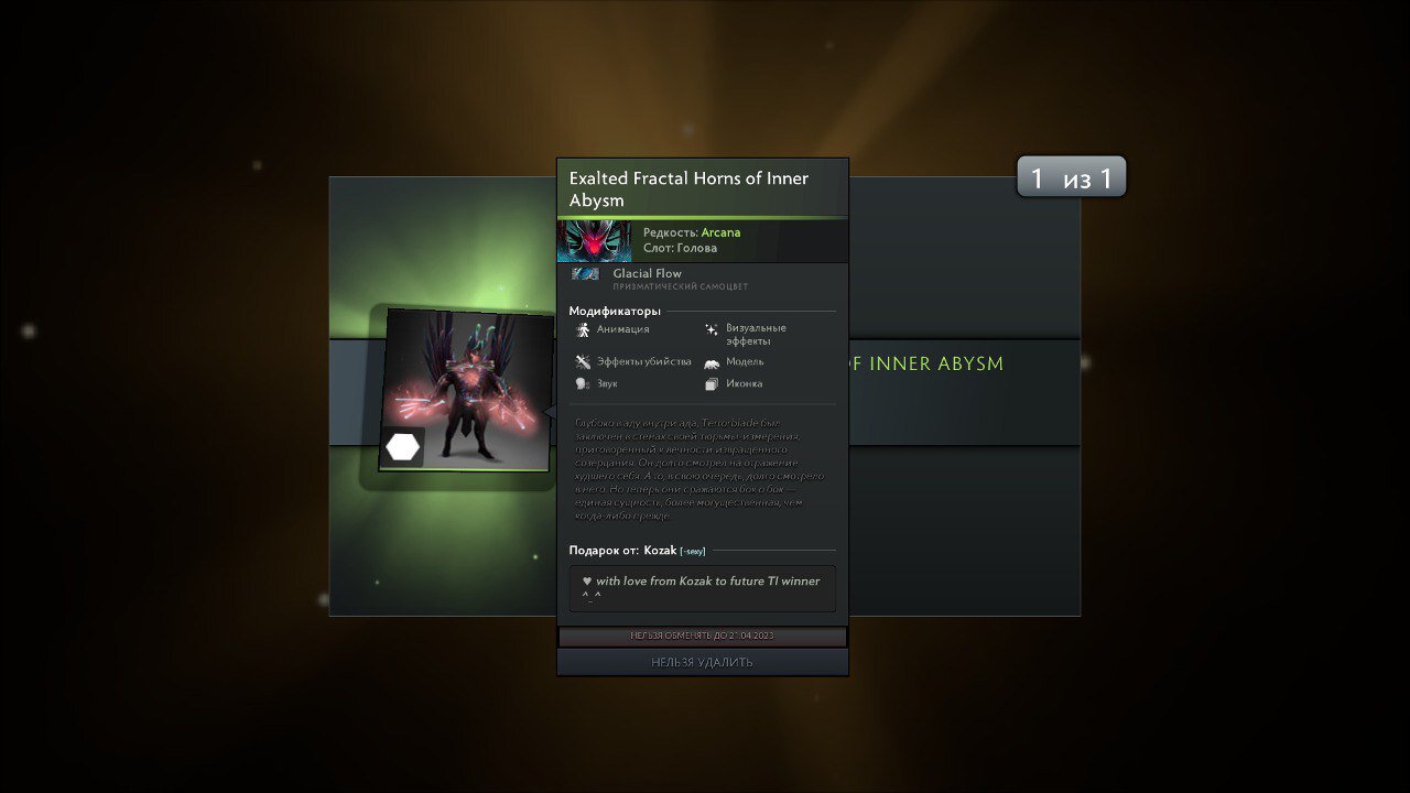 Владелец и тренер Team Sexy Владислав «Kozak» Лазуренко подарил керри Entity Алимжану «watson» Исламбекову редкую аркану с гемом с Ice Baby Roshan. На торговых площадках ее стоимость составляет около $500.