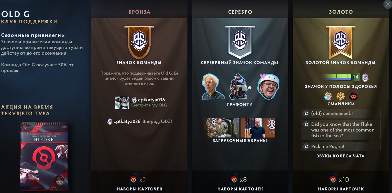 В набор Old G вошли загрузочные экраны с состарившимися Йоханом «N0tail» Сундштайном и Топиасом «Topson» Таавитсайненом, граффити с Себастьяном «Ceb» Дебсом на коляске и бабушкой-Топсоном.