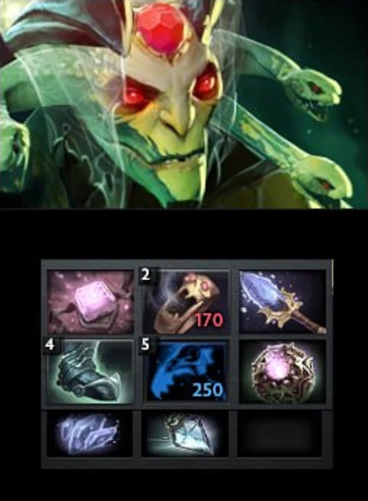 Щит поглощает 98% урона и является приоритетом №1 по подсчету урона, поэтому всякие барьеры и Shroud не работают на Медузе, нужно выходить в ману и манареген + что-то делать в замесе > отсюда Aghanim’s Sceptre и Shard. На линии легко стоять, змейка бесплатная.
