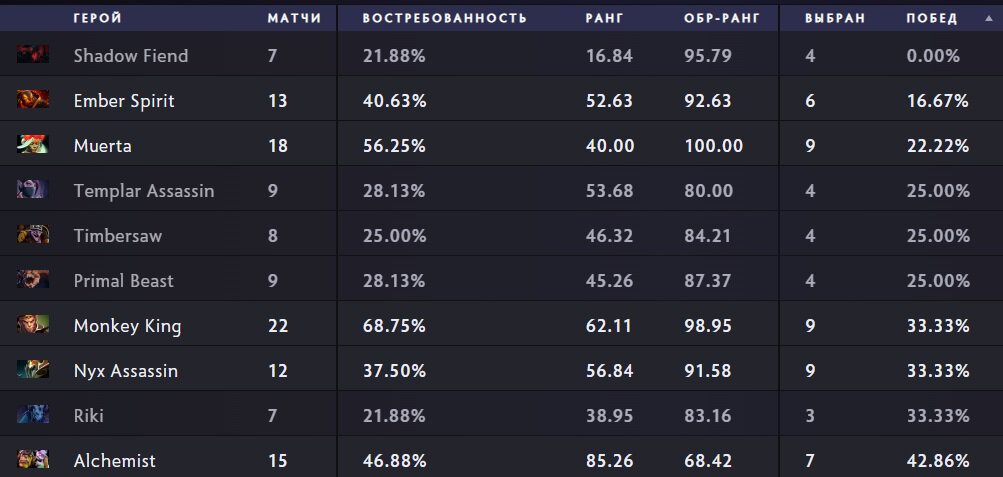 Худший показатель у Эмбера, он выиграл всего 1 из 6 матчей, поэтому его винрейт составляет 16,67%.