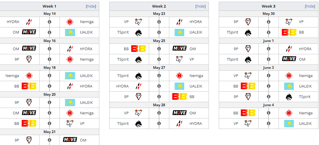 Сезон стартует 14 мая. В первый день Hydra сыграет с Nemiga, а One Move – с Ualeikumnihao.