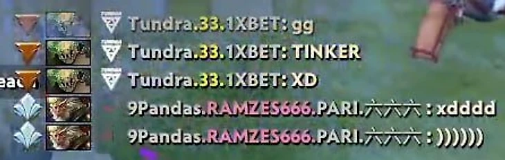 33 – в общий чат после матча: «gg TINKER XD», Ramzes666 ответил: «xddddd))))))»