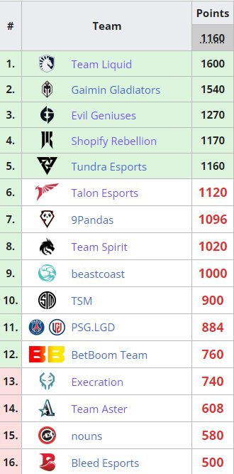 По подсчетам Liquipedia, команда Артура «Arteezy» Бабаева занимает 4-ю строчку в таблице DPC с 1170 очками. Чемпион TI11 Tundra набрала 1160 очков и тоже гарантировала себе слот на главном турнире года.