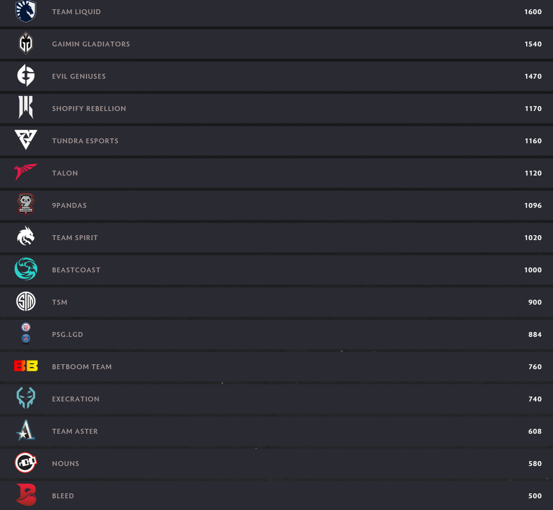 На данный момент участие на The International себе гарантировали Liquid, Gladiators, Evil Geniuses, Shopify Rebelion и Tundra.
