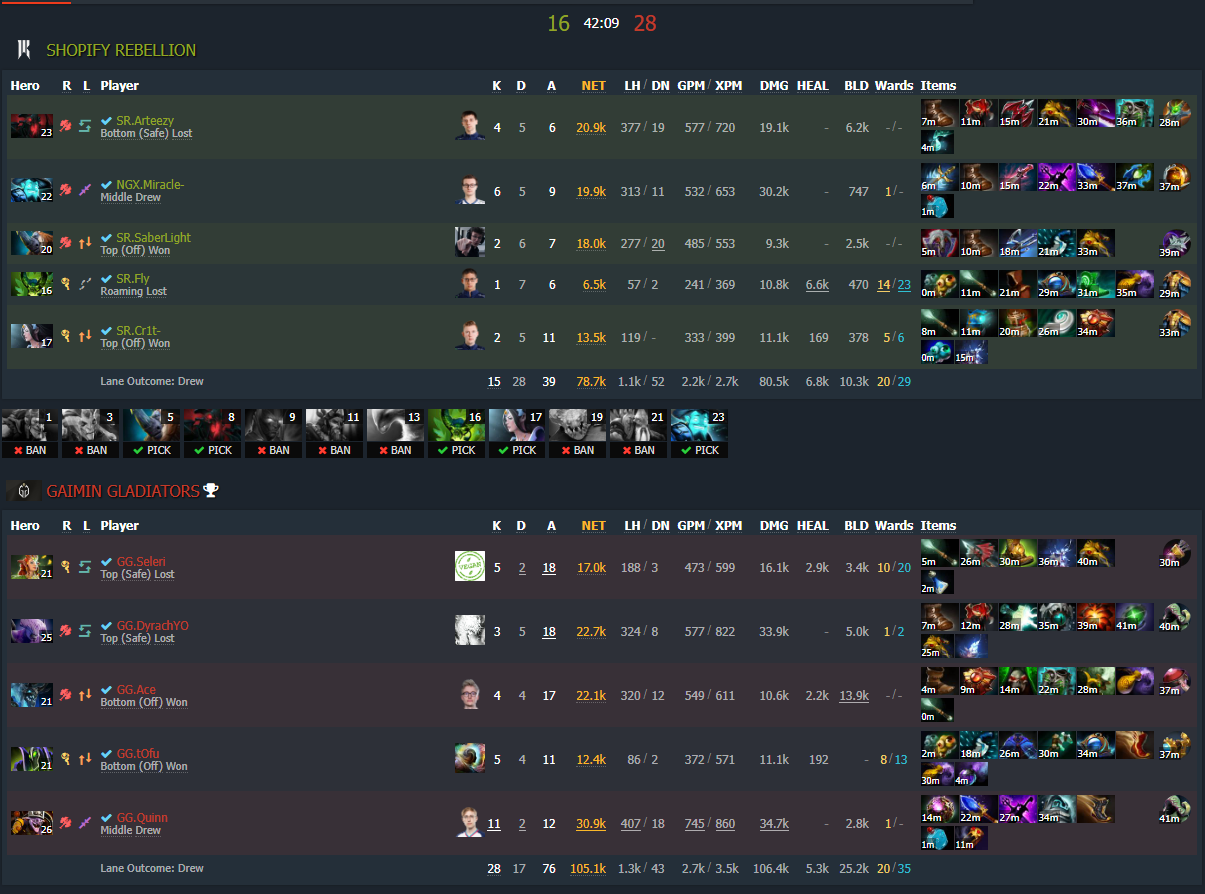 Первую карту серии Shopify Rebellion проиграла, но выиграла вторую. На первой Miracle играл на Storm Spirit и завершил карту с KDA 6/5/9 и 30 тыс. урона (лучший результат в команде).