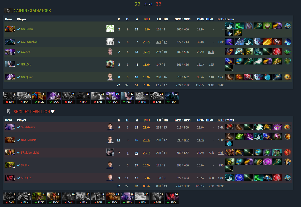 Miracle нанес 35% урона Shopify Rebellion в серии против Gladiators. Общее KDA – 19/8/25