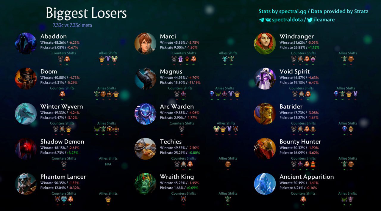 Согласно данным от аналитика Tundra, сильнее всех пострадали Abaddon и Marci. У героев просел и пикрейт, и частота побед.