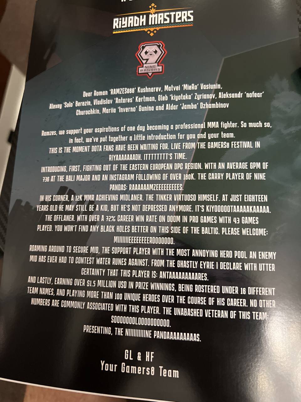 «Никаких разговоров. Никаких отвлекающих факторов. Только Дота. Мы включим наши брандмауэры и поместим Ивана в пластиковый пузырь, если надо. Этот турнир пройдет отлично для вас, ребята. Обещаем», – говорится в буклете BetBoom.