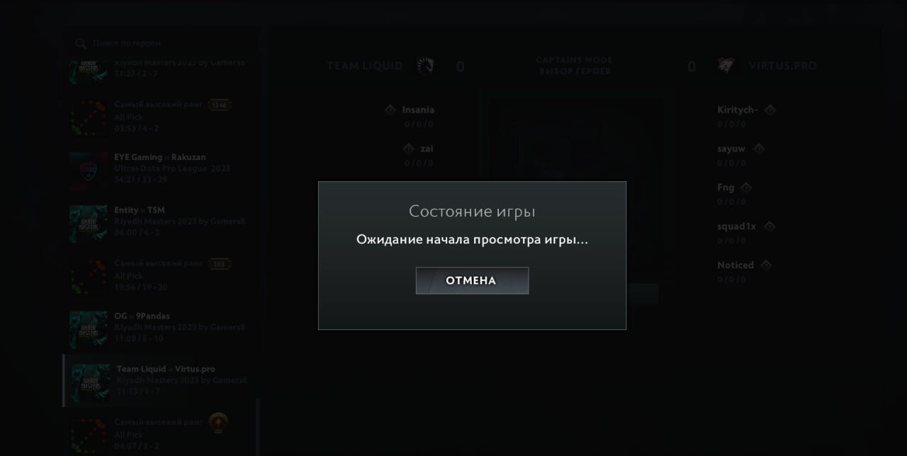 Если найти игры через вкладку «Просмотр», то в матчах 9Pandas – OG и Virtus.proLiquid идет бесконечная загрузка.
