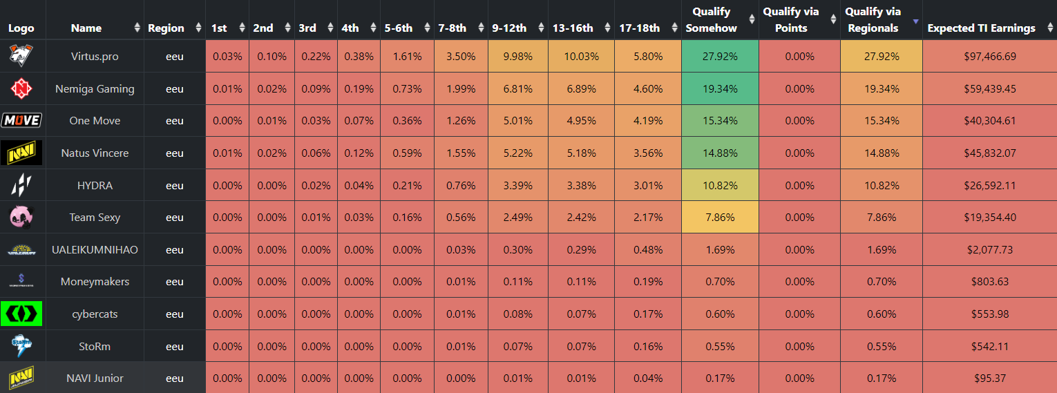 Согласно данным Бена «Noxville» Стеенхойзена, шансы Virtus.pro пройти на TI 12 равняются 27,92%. Вероятность, что чемпионат мира по Доте пройдут Nemiga и One Move равняется 19,34% и 15,34% соответственно.