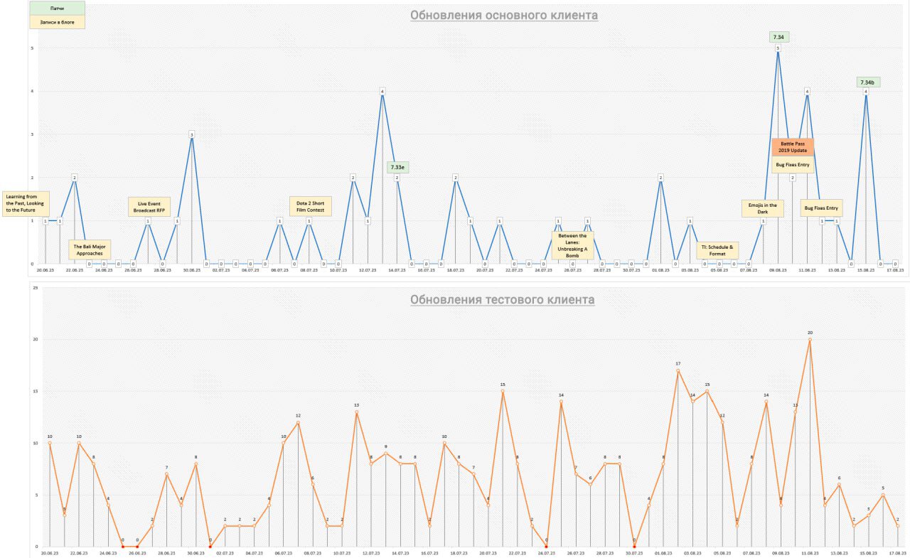 «В июне Valve сообщила, что будет делать упор на геймплейных обновлениях. На основе работ muk_as решил это проверить и посчитать, сколько раз был обновлен основной и тестовый клиенты игры. В итоге получилась такая картинка. Почти каждый день были какие-то введения, хоть обновления файлов локализации.