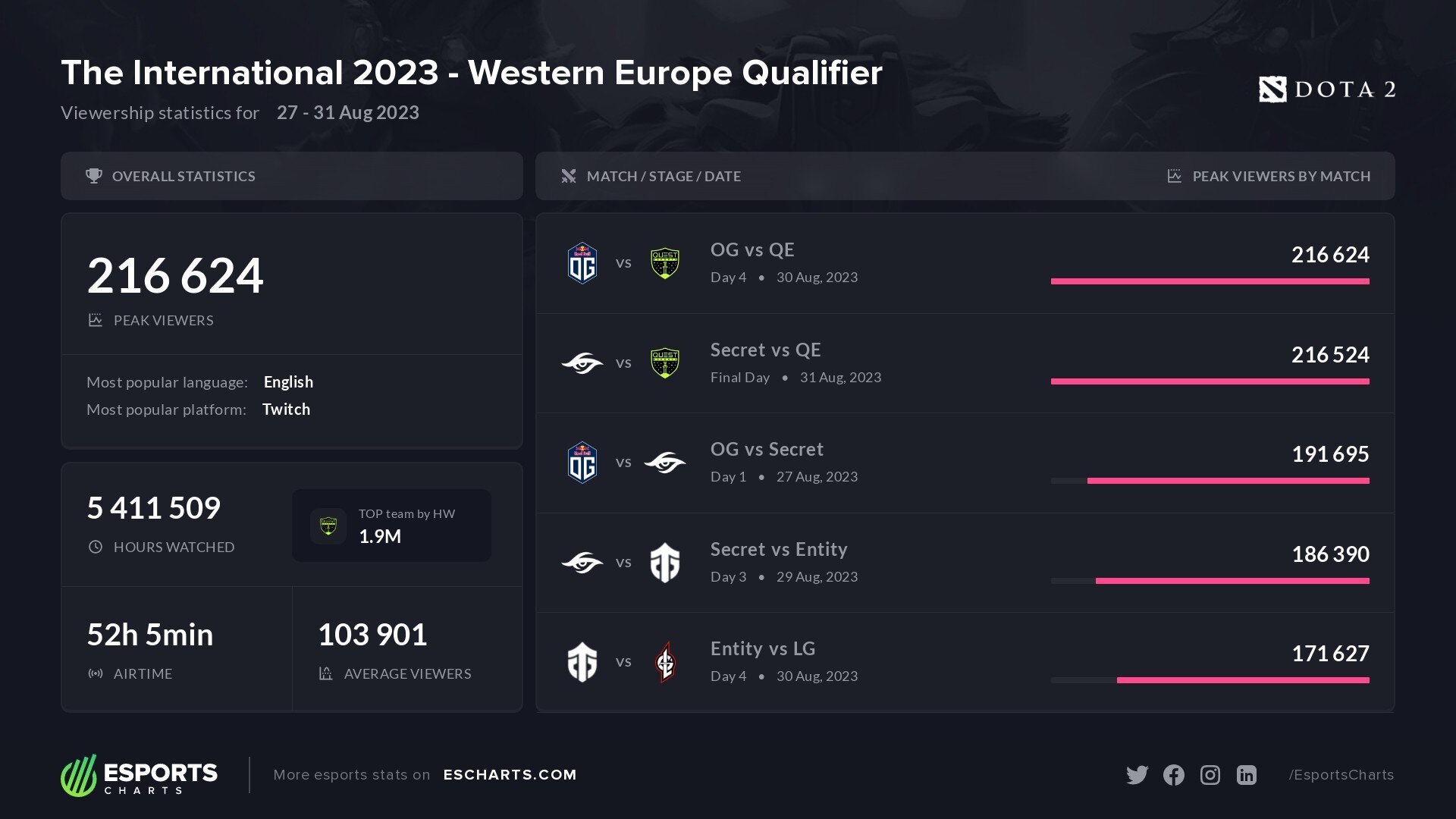 Esports Charts поделились статистикой просмотров матчей европейской квалификации на The International 2023.