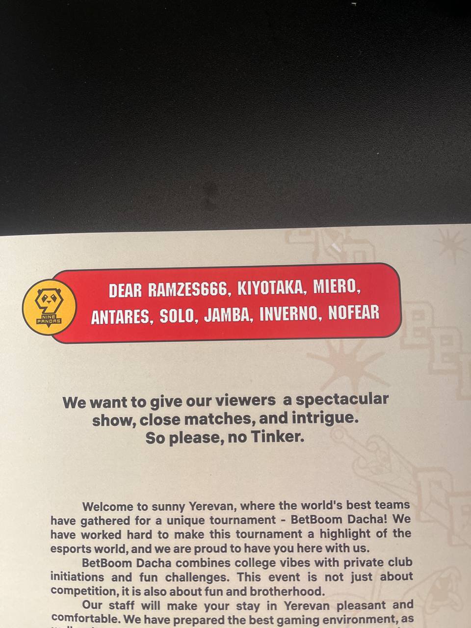 Глеб «Kiyotaka» Зырянов показал письмо от организаторов чемпионата, в котором они попросили мидера 9Pandas не играть на Тинкере.