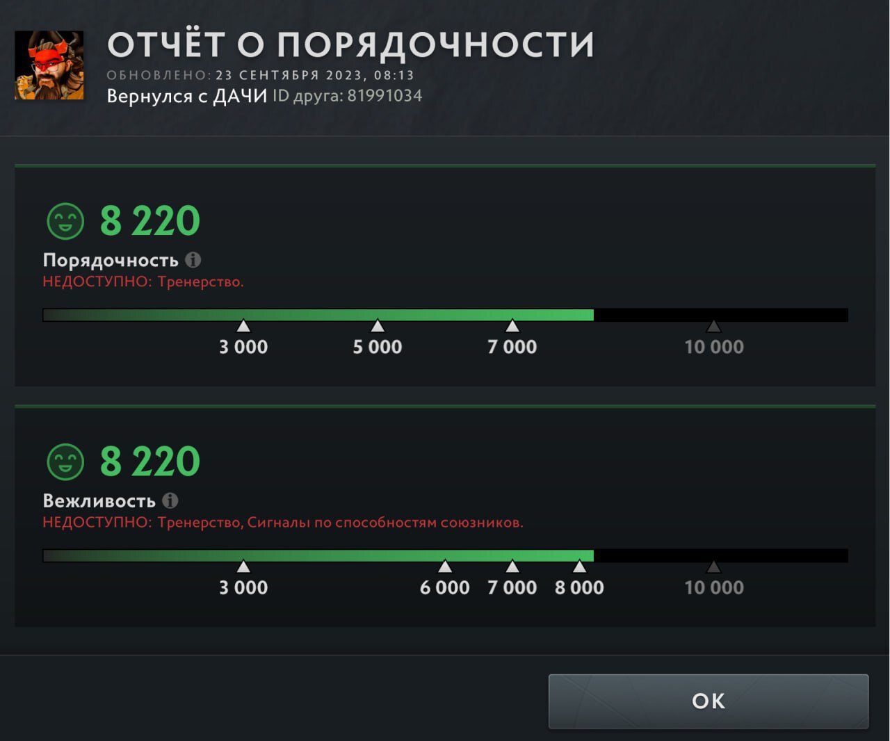 Стример продемонстрировал, что на данный момент имеет 8220 порядочности и вежливости.