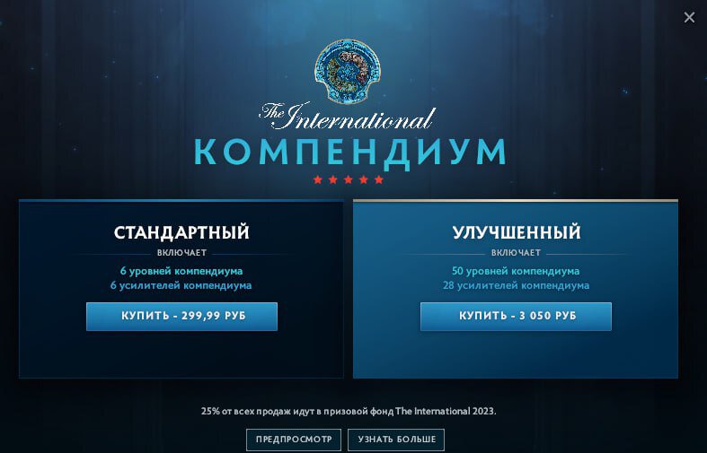 Цена на стандартный компендиум составляет 7,5 доллара (чуть больше 700 рублей), но в Доте указана цена в 300 рублей.