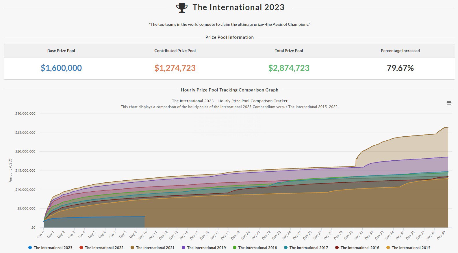 На данный момент призовой фонд The International 2023 составляет 2,874,7 млн долларов.