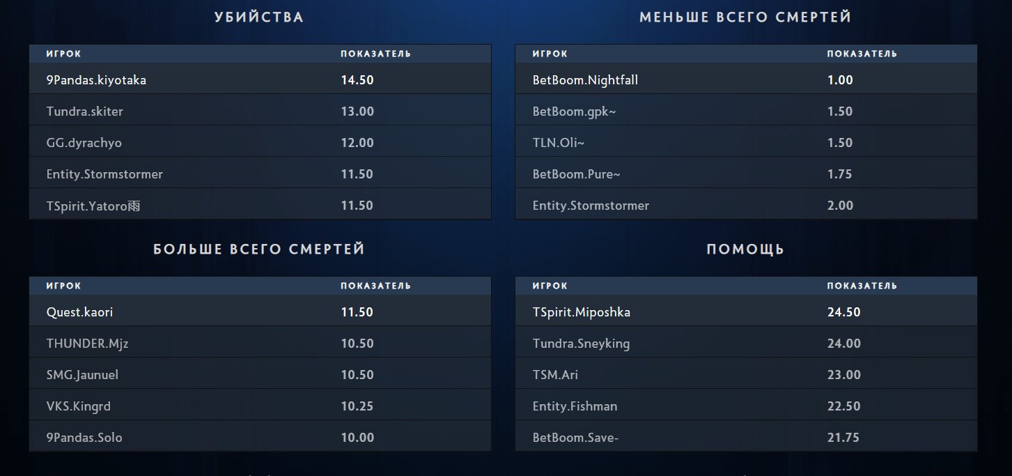 По наибольшему среднему числу фрагов лидирует Глеб «Kiyotaka» Зырянов – 14,5.