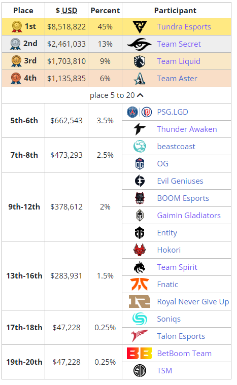 В 2023 году за 17-20-е место положен 1% призовых, на TI11 выдавали 0,25%.