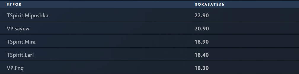 Отметим, что в топ-5 вошел мидер Spirit Денис «Larl» Сигитов (18,40). Список замкнул Артем «Fng» Баршак (18,30).