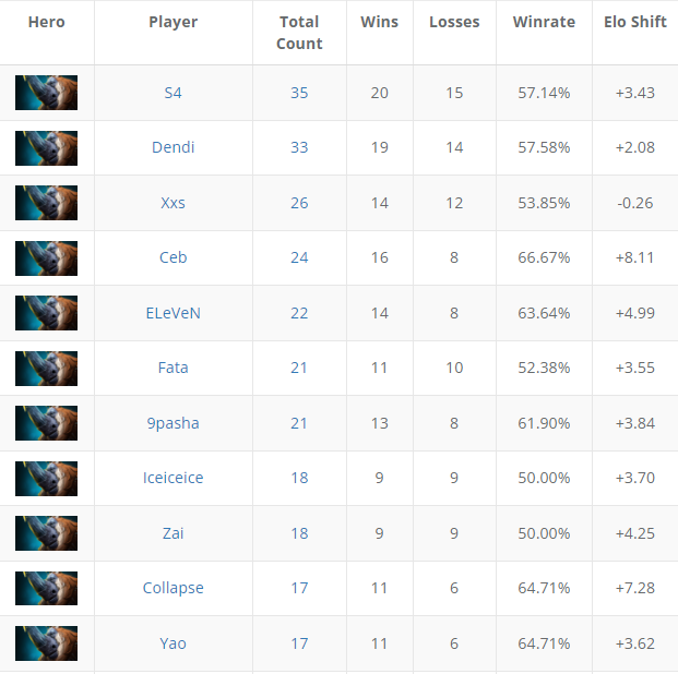 Больше всего игр на Магнусе сыграли S4 (35), Dendi (33) и Xxs (26).