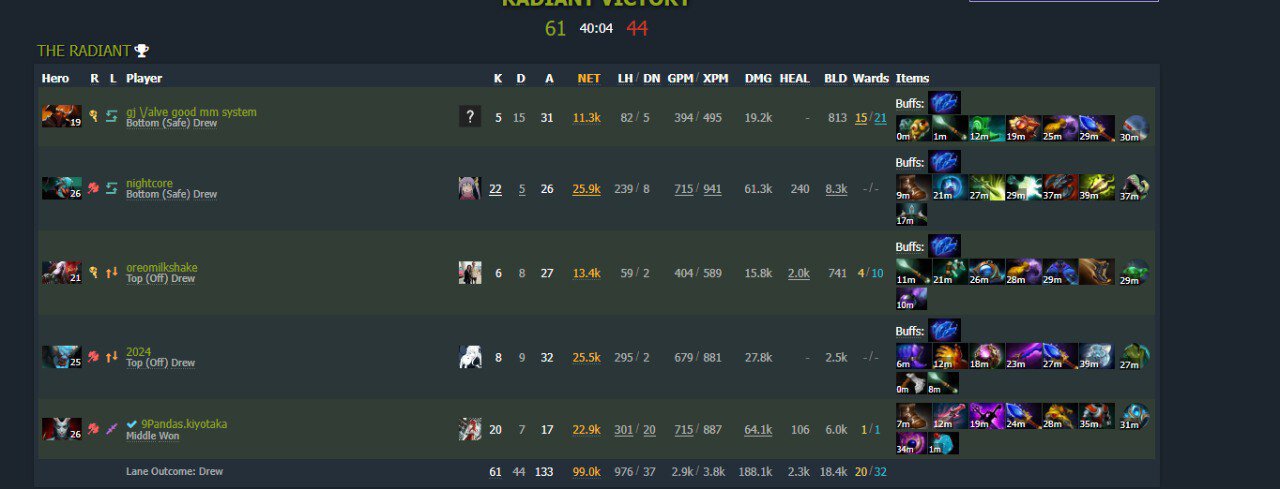 Malady закончил со счетом 5-15-31 на саппорт ЦК, Kiyotaka – 20-7-17 на мидовой Квопе.