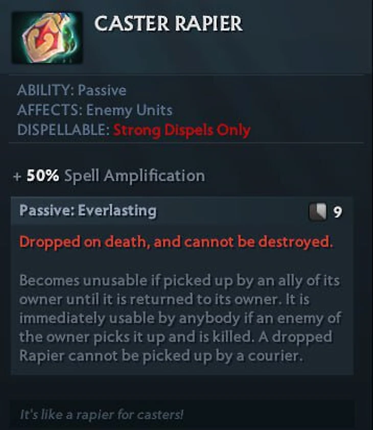 Caster Rapier – альтернатива Divine Rapier для волшебников. Предмет стоит 5,6 тысяч золота, увеличивает урон от заклинаний на 50% и выпадает при смерти.