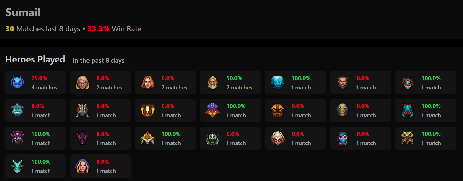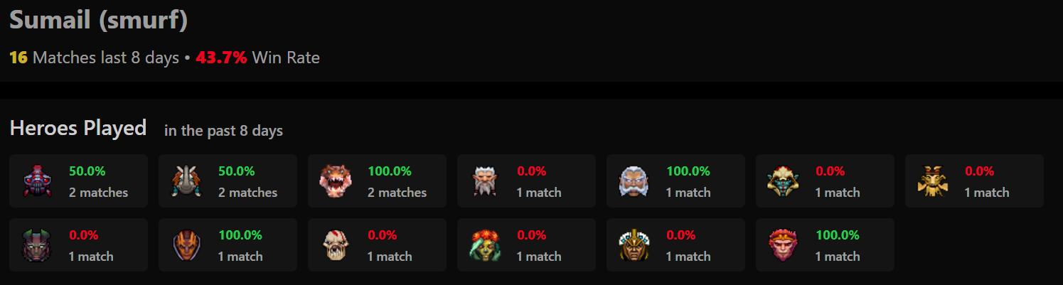 На основном аккаунте Сумаила доля побед за 30 матчей составила 33,3%, на смурфе – 43.7% за 16 игр.