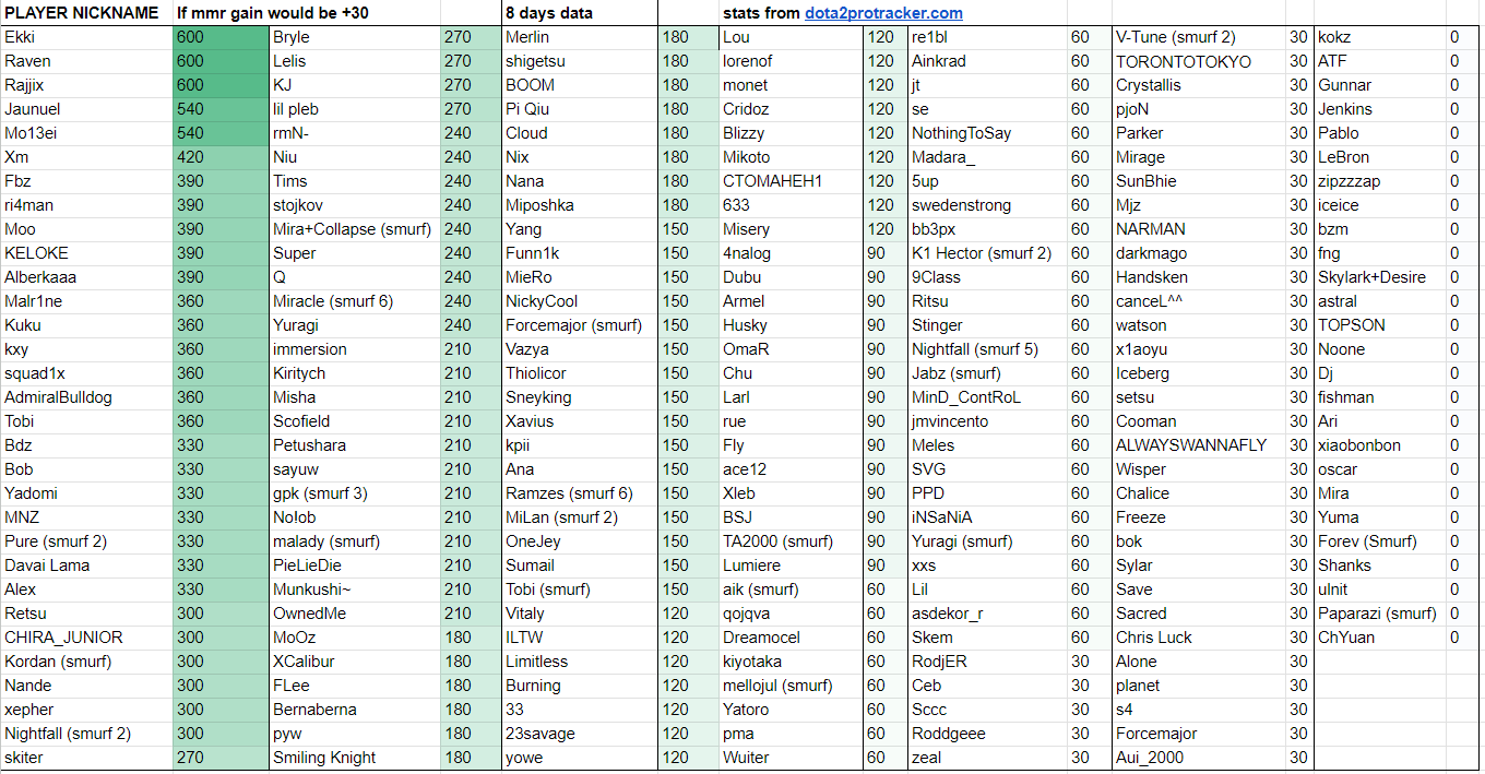 «Если бы система давал по +30/-30 MMR, то вот игроки, кто набрал бы больше всего очков рейтинга за последние восемь дней», – написал Иван «Kidaro» Бондарев.