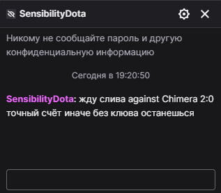 «Походу, я масть поймал. Слышал, что подобное он (Кибер: Sensibility) писал кому-то из Sibe Team, видимо напрямую с ним никто не хочет работать, поэтому строчит угрозы. Придется закрыть личку, чтобы больше не получать подобных сообщений. Вдвойне обидно, что ######## [проиграли]», – написал Владислав «Petushara» Козловский.