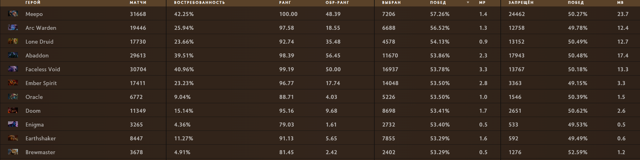 Винрейт Meepo на ранге «Титан» составляет 57,26 за 7206 матчей. При этом персонажа забанили 24 тысячи раз.