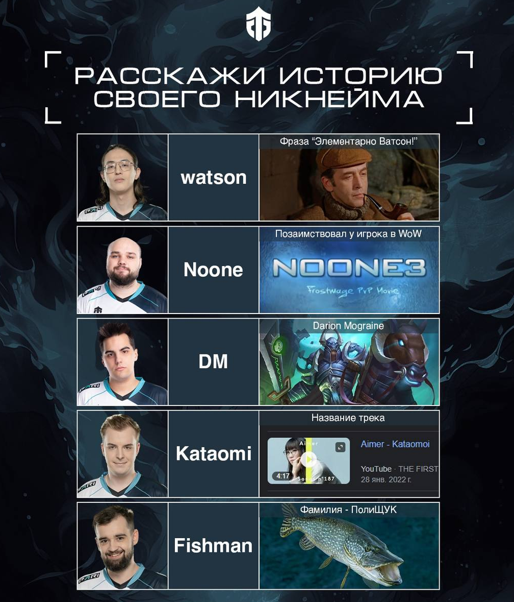 Fishman взял ник из-за «щуки» в фамилии, DM – Дарион Могрейн из WoW, Kataomi – название песни