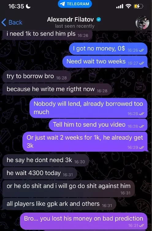 «У меня большие проблемы. Так что мне нужно немного инфы, бро. Убьют меня и мою семью. Если я не хочу, чтобы это произошло, я должен отдать 2300 долларов до 19 августа. Без шуток, ты можешь написать Root (Кибер: по информации Metaratings, это организатор подставных матчей, связанный с Sensibility) и спросить. Я дал ему все пруфы. Дверь квартиры, где живет моя семья, была уничтожена этой ночью. Позвони мне как сможешь, бро.»