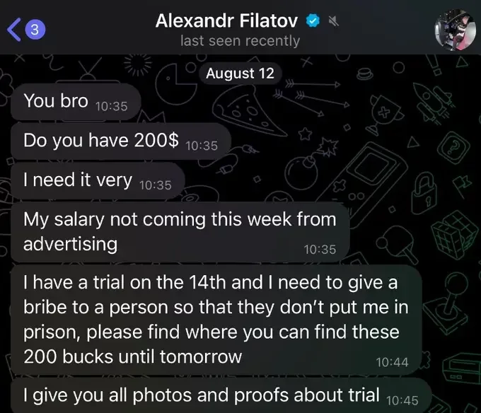 Скриншоты переписок опубликовало издание Metaratings. В 2023 году Александр «Sensibility» Филатов неоднократно просил в долг у неизвестного собеседника, чтобы отдать деньги своему подписчику: